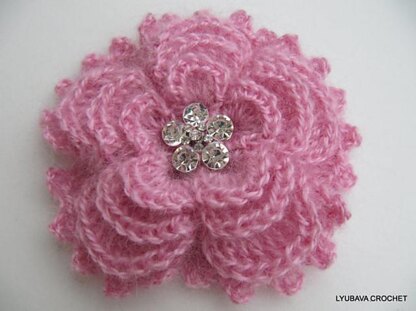PDF file Crochet Pattern "Mohair Brooch Flower 5 petals, 4 layers" with written instructions in English, American crochet terms.