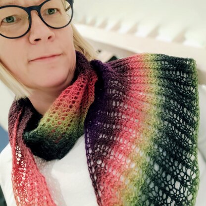 One skein scarf. Has schematic and chart. Caleido’s alpaca silk yarn is light and soft to touch while knitting. And one ball is so plentiful it just goes on and on. So you are able to finish this scarf out of one skein using thick needles. This pattern will look good on both sides, because there is no right or wrong side.