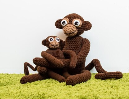 You can use any weight yarn for this project. The small monkey uses a small hook, yarn held single, and single crochet stitches throughout. The large monkey uses a larger hook, yarn held double, and half double crochet stitches. You can use this simple trick on almost any pattern where gauge and fit aren’t critical.