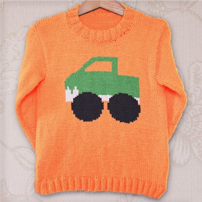 This is my classic children's round neck set-in sleeve sweater pattern with an image of a Monster Truck on the front.