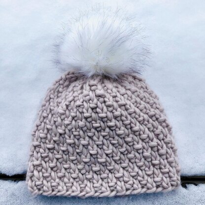 The Montebello Beanie is a warm chunky knit hat pattern with a more traditional beanie design and beautiful stitch texture. It is a pattern that is quick to knit up and is fun to make with easy multiple round repeats.
