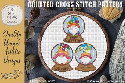 3 Adorable Monthly Gnome Snow Globe counted cross stitch designs!\n\nCross Stitch designs by Marcia Manning.\n\nEach Snow Globe is 64 stitches wide by 81 stitches high.\nSize 11 count: 5.82 x 7.36 inches or 14.78 x 18.70 cm\nSize 14 count: 4.57 x 5.79 inches or 11.61 x 14.70 cm\nSize 16 count: 4.00 x 5.06 inches or 10.16 x 12.86 cm\nSize 18 count: 3.56 x 4.50 inches or 9.03 x 11.43 cm\n\nStitch the words in the base to your liking or omit words entirely.