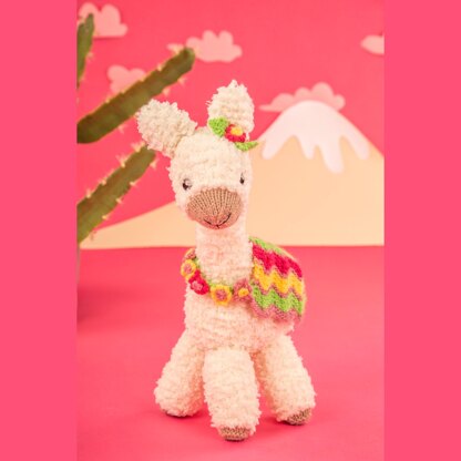 This cuddly llama is the leader of the pack! Monty has travelled all the way from Peru to sprinkle some sunshine into your day. They have a colourful chevron striped saddle blanket with floral decorations. This llama is mainly made from a gorgeous fluffy chunky weight yarn, with the blanket and decorations made from a standard DK yarn. Designed by Amanda Berry @fluffandfuzz, the toy is knitted on single pointed needles (not in the round). For confident beginners and above, other techniques used include casting on and off, knits, purls, increases and decreases, and seaming to finish. Monty is 40cm tall (from toes to top of ears).