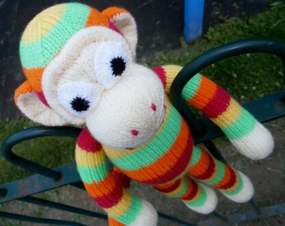 Monty is a jolly monkey, made from bright colours and with long legs, arms and tail, making him an ideal first gift for a baby. Knitted in stocking stitch, he is a fairly simple knit, whilst the small amounts of yarn needed in each colour (less than half a ball of each of the main colours) make this project an ideal stash buster.