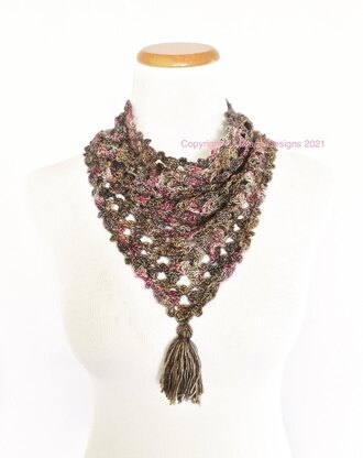 Moon Rocks is a simple bandana-style cowl that is crocheted flat from the bottom up with an easy two-row repeat, then lightly wet blocked and seamed, The stitch pattern is an open mesh and features small bumps, picot stitches, in the openings of the ch 2 spaces giving an interesting look to the stitch pattern.