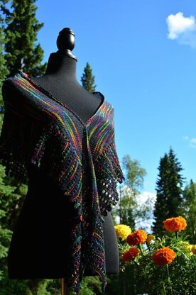Vertical and horizontal stripes of hand-dyed rainbow hues come together in this easy-to-knit crescent shawl. Beginning with a wavy lace edge worked side-to-side, then shaped with short rows for a gently tapered Stockinette center…this lightweight shawl is sure to become a year around favorite.