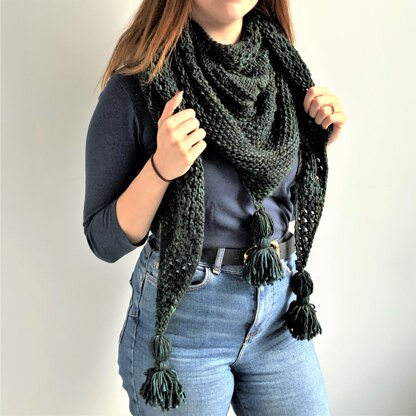 Chunky/bulky yarn and larger than usual needles mean the resulting scarf shawl is fluid and not too thick – perfect as a shawl for summer evenings or for wearing over your coat as a warm scarf, in the winter. Add 3 tassels or not – both styles are lovely.