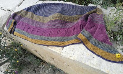 The Moorlands Romance Shawl This is a crescent shaped shawl in shades of heather and moss to create a very natural, earthy but still feminine canvas of a shawl. It builds first with an easy striped garter panel to get you going on the shape, then into the texture of the double moss stitch, then a lace panel and a traditional basket stitch pattern. Each yarn color is used to both blend with another and be worked alone to give a balanced color rich result. The shape is formed initially by a swift increase from 5 stitches by way of KFB increases and then at each end of the shawl. With its simple construction and repeated stitch patterns it makes for an enjoyable play with color and textures. Within the last Moss stitch section of the shawl you can extend the size which would require a further skein of Yarn A or to make use of the leftovers