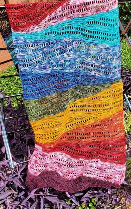 This wrap is worked flat across the short dimension. It consists of a series of triangles that bend the colors in different directions. The pattern uses short rows for the triangle shaping