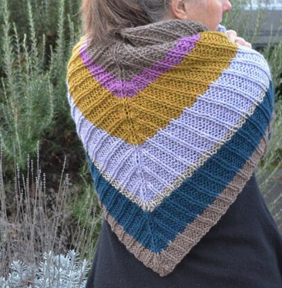 This soft shawl/shawlette seems as basic and essential as a morning cup of coffee or tea. The slip stitch pattern is simple, and the shape is a classic triangle,worked from the bottom up so rows get smaller as you go.