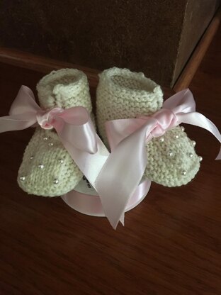 Quick to knit baby booties. They feature a Garter rib sole and Stockinette instep for optional pearls or beads to be sewn on after. Eyelets on the cuff make changing the ribbon color quick and easy.