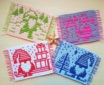 Each design has a 48 stitch repeat so are very compatible with other designs of 48, 24, 12 or 6 stitch repeats. The trees are designed to be used as a divider strip. One gnome design using Catona measures 24 cm x 20 cm (9 ½” x 7 ¾”) not including the fringe. Any yarn can be used but size will vary.