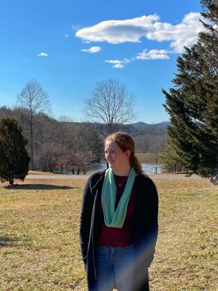 This lovely cowl is light and lacy, perfect for those cool spring days! The stitches are simple and repetitive, making this a perfect quick knit while you are sitting on the couch.