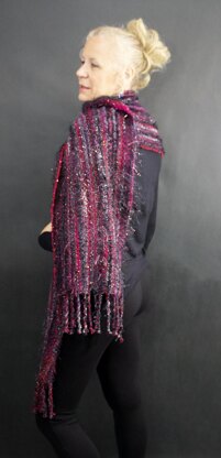 This wrap is soft and light, the half linen stitch gives it textures and shows off all the yarns use. The only yarn doubled is Prism Radiant Petite Madison Work in the order that the pattern is written, or just do your own sequence, it will all look fantastic in the end. IF you want fringes, cut yarn 8 inches at each end of each row. If you do not, leave enough to weave your ends....