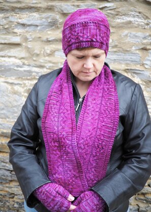 Disappearing, subtle cables run the length of this scarf. Mount Temple is an imposing mountain overlooking Lake Louise, Alberta, in Banff National Park. There are a matching hat and mitts available. Finished Size: 7” width, 50” length once wet blocked