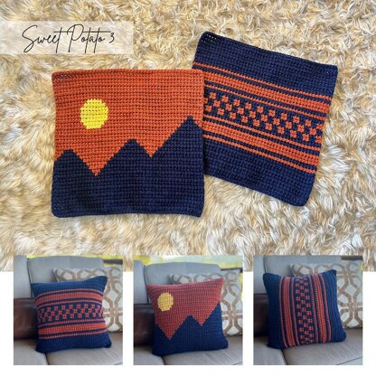 Bring home the magic of a Mountain Sunset in this unique and fun crochet pillow design. The pillow cover is made by crocheting two (2) squares that will then be stitched together to encase a pillow form. One square features the silhouette of mountain peaks and a sun setting (or moon rising). The second square features fun a fun striping pattern with a little checkerboard pattern to elevate the design. The striping can run horizontal or vertical giving your room the perfect look.