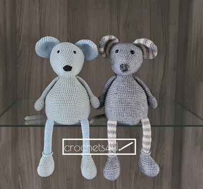 - the mouse with the light blue stripes is crocheted with Catona: +/- 100 grams in total - the mouse with the white stripes is crocheted with Stone Washed: +/- 115 grams in total