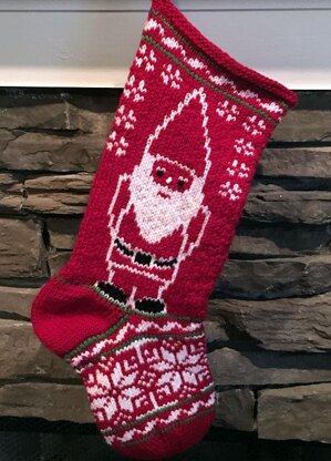 Meet Mr. Gnome. Mr. Gnome wanted his very own stocking this year with traditional Nordic colors and motifs. With snowflakes and bands of ribbon, Mr. Gnome will brighten your holiday.