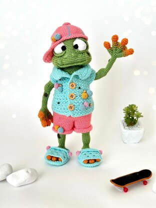 Splash! Splash! Splash! Who is this guy walking through the swamp with his long flippers and waving his hand to everyone? Look at him, this cool guy is dressed in the latest fashion! His name is Splash. He is a cute little frog with two arms, two legs, and fourteen fingers. In the morning, he likes to chat with everyone and eat mosquitoes Well, today I will tell and show you how to crochet this overseas prince. I tried to make a detailed pattern of the body and clothes – a favorite cap, a beautiful T-shirt, bright shorts, and fashionable Crocs. By the way, the toy is crocheted with a crochet hook only. The toy is made from the wireframe, which will help to fix any desired position. He can bend his legs, arms, neck, and even fingers. He is very obedient and will gladly hold any light objects in his hands. The crochet pattern consists of 48 pages and includes more than 120 photographs and charts. The height of the toy using the stated materials is about 26 cm/10.2 inches.