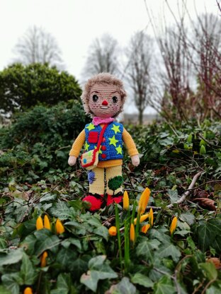 This is NO SEWING, NO FACE SCULPTURING pattern. The doll is crochet as one piece starting from legs; only waistcoat and bag are removable. I'm a firm opponents of inserting a wire carcas in crochet dolls which are made to play with, not a derocative item. The perinial problem in such situation is a wobbly head; this pattern provides a unique solution to this problem; there is no wire support required. In addition to the pattern for the doll’s body, it includes a pattern for hair and crochet eyes.