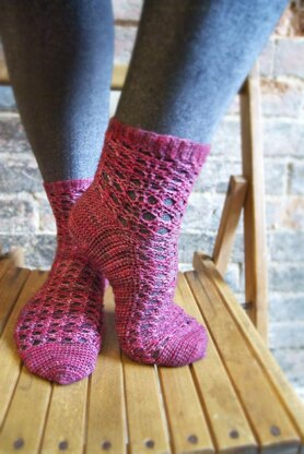 Glamorous and sophisticated, perfect for festive celebrations, I picture these socks over sparkly tights inside a pair or gorgeous heels. Worked toe up with a solid sole and lacy top, a reversed turned heel and lacy ankle, finished with a ribbed cuff.