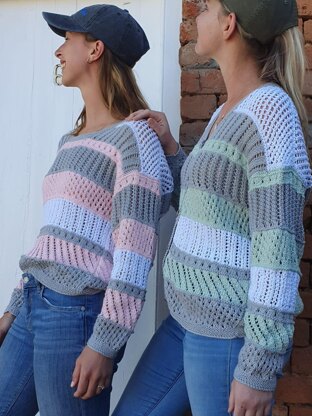 A fun multi-pattern, multicoloured pullover and cardigan pattern to knit in various sizes.