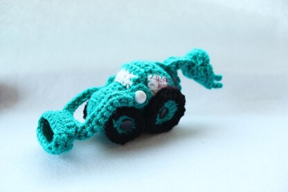 This little multifunctional tractor was a request from my kids for their road mat blanket. The wheels (a choice of tractor wheels or caterpillar wheels) and implements (front bucket, bulldozer and backhoe) are all attached using a series of buttons. The buttons for the front bucket and bulldozer attachments double as side mirrors and the buttons to attach the backhoe double as a warning light (on top) and a tow back (at the rear).
