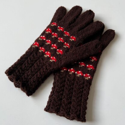 Inspired by the quiet beauty of woodland walks and autumn mushrooms, these whimsical gloves feature elegant cables, delicate colourwork, and a charming mushroom motif at the fingertip.