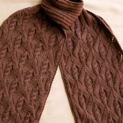If you love knitting cable lace, you will truly enjoy making and using this stitch pattern. It makes a lovely scarf, but of course, you can use the stitch pattern for any flat garment that you like. This pattern for a knitted scarf is written so that you may choose whether you would like to use either sport weight yarn or worsted weight yarn. Should you elect to make the scarf with the turtleneck, even the sport weight will keep you warm. If you would like to make it a blanket, use the worsted weight, with as much yardage necessary to get the blanket that you desire. The focal stitch is both written out, and charted, and there are directions for an optional crocheted edging for both gauges. Skill Level: Intermediate (assuming a good working knowledge of cabling and lace knitting.) Skill Level for the optional Edging: Intermediate (assuming a working knowledge of crocheting)