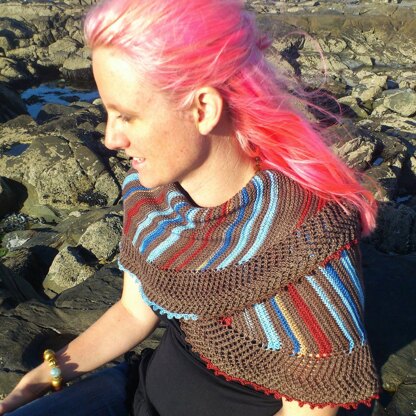 I love self-striping yarn, but it can be hard to use in a shawl, this inspired me to use a skein of self-striping yarn with a complementary colour and knit them sideways to make this lovely shawl. The simple eyelet lace is added on afterwards. You can use variegated, speckled or even solid colours to make your stripes.
