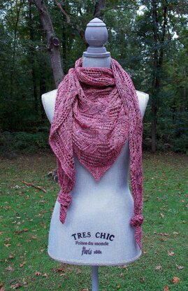 She was stunning! My daughter wore a beautiful red, silk Japanese Furisode Kimono. It had lots of leaves and floral designs and golden threads throughout. Since then, I’ve had kimono fever. But, I’m a busty babe. My curvy figure is just not the column body type for which kimonos were created. The only way to make me into a column is to strap puffy pillows and towels under the “girls” to even me out, or gasp, duct tape them down. Hell, shaping would be easier if I stole a barrel off a rodeo clown and used that under the kimono. Given my new hobby—hot flashing—the barrel would be a lot cooler too. Yah, not doing that. It occurred to me that not everybody can wear a kimono, but every woman can wear a shawl and look good. This elegant shawl features a kimono lace made up of simple mesh and leaves. It invokes the graceful beauty of a kimono without the complication of trying to wear one. Knit from one edge to the other, the construction is effortless and easy to remember.