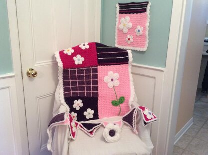 This is a pattern for a baby blanket, wall hanging. bunting and rattle.