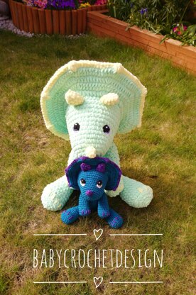 To complete Mini Dinosaur you will need 40g Dk/light worsted yarn in main colour 30g dk/light worsted yarn in contrasting colour 2mm hook for dk. Blue, white and black dk yarn for crochet eyes. 10mm Safety eyes Polyester toy stuffing. Needle Mini Triceratops made with dk / light worsted will measure approximately 11 inches from head to toe when finished (8 inches when sat)