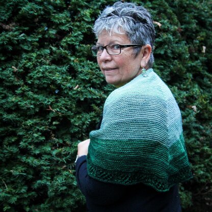 My Own Back Yard is a top-down, half-hexagonal shawl with a simple, garter stitch body and mock i-cord edging and a lovely, but simple, lace border. It works well for a gradient yarn set, but it can also be used with tonal, variegated or speckled yarn or any combination of these.