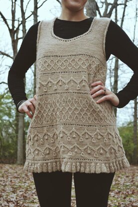 The Nadia Tunic is an intricate knit top with eastern inspired motifs. Knit tassels and various cables are worked on a reverse stockinette background for a stunning overall effect. The piece is worked flat as two pieces and seamed with the neckline and armhole edges picked up afterward and worked as a smooth i-cord bind off. This tunic is a serious statement piece; the length and A-line silhouette make it perfect for layering throughout all seasons!