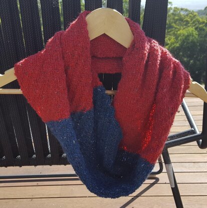 This textured Cowl or Scarf is worked in a diagonal rib stitch, and has a contrasting colour section in the centre. The photos show the Cowl only. The Scarf is half the width but twice the length of the Cowl. For the matching diagonal rib beanie, please see my Trinity pattern.