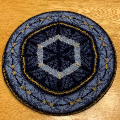 This nautical tam uses five shades of Jamieson's of Shetland Spindrift. It's an easy and enjoyable knit. Knitted in the round it has a corrugated rib and Fair Isle patterning.