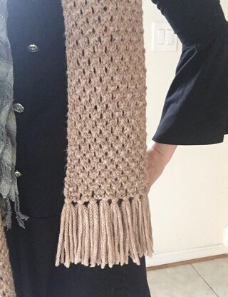 Openwork with knobby purl bumps are knit in a bulky, chainette yarn to create a warm, fluffy, gender-neutral, textured scarf that knits up quickly. The rich pattern looks complex but is easy to knit. The wide width allows you to fold it in half while wearing it for extra coziness.