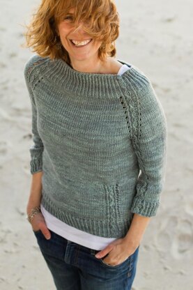 Knit in a gorgeous blue-gray, like the sky and water on the beach in spring. A classic pullover with delicate slip stitch cabling details, which are supposed to look like little waves at the edge of the sand. Twisted rib compliments the yarn and the stitch detail - which continues down the arms, a little hidden, but not quite. The body skimming shape is flattering, with ¾ sleeves and a wide neckline that gives it a vintage vibe and shows a hint of the tank you wear beneath, just in case the sun does warm up and you can lay down on the sand. Lastly, a little detail at the hip for a bonus. Width, length or sleeves can easily be modified, and the knitting is easy, with just enough detail to keep you busy. Sample pictured in Plucky Knitter, Merino Superwash Lite. Substitute yarns need to be visually subtle, to showcase the classic stitch detail, and have a softness, light wool or a cotton wool mix. Choose a colour that makes you come alive! Always check your gauge.