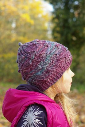 This lovely hat is playing with mock cables, twisted stitches, lace motif and some fun bobbles. These elements combine to create a whimsical hat that is as enjoyable to make as it is to wear. Both written and charted instructions are included.
