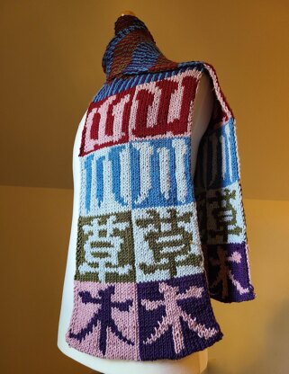 This is a double-knit scarf using redesigned Amimoji motifs. The motifs are Japanese Kanji characters, Yama (山), Kawa (川), Kusa (草), Ki (木), meaning Mountain, River, Grass, Tree, respectively.