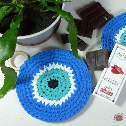 This is the perfect beginner-friendly pattern for a colorful and impressive potholder/trivet with T-shirt yarn.