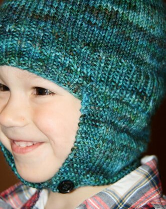 My children were the inspiration for this neck-warmer ear-flap hat. I disliked dealing with scarves and the kids just couldn’t manage them well. I also didn’t want ties at the neck that would get caught in the zipper of their coat. The button keeps this all-in-one hat in place and their neck and cheeks stay warm. The hat is knit in the round from the bottom up and then stitches are picked up for the neck-warmer, ear- flap portion which is created by knitting short rows flat. There is the option to omit the button flap as well if you only desire the neck warmer.