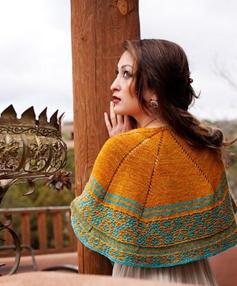 This slightly larger than half-hexagonal shawl is worked from the neck down and features a wide slip-stitch patterned band at the hem. The shawl begins with a garter-tab and is worked with y/o increases in pie-shaped segments in the MC to the bottom border. A second CC is used to work a slip-stitch/mosiac pattern. The sample used less than 1 full skein of the MC (yellow) and slightly less than a 1/2-skein of the CC (blue).