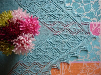 Nenúfar is a triangular shawl knitted bottom-up with a lace stitch resembling water lilies. It starts with a few stitches and gradually increases size. The lace pattern is combined with a stockinette middle section creating elegant diagonal lines. This pattern offers some design options - if may work an entirely lace shawl by repeating one of the the charts until you get the desired size. As shown has a stockinette insertion with wide lace borders followed by a lace motif knitted in the middle. The borders are worked in true lace adding interest to this shawl easily customizable by changing the number of pattern repeats.