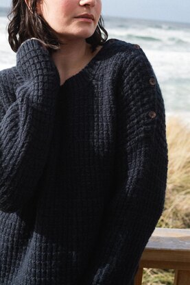 N O T E S The pullover is worked from the top down. Back is knit first, with short row shaping for shoulders. Left front is worked next, starting with shoulder placket, and worked to base of neck. Stitches are picked up for the right front and worked to base of neck, then fronts are joined and worked to the underarm. Front and back are joined to work the body in the round to the hem. Stitches are picked up at the armhole to knit the sleeve in the round to the cuff.