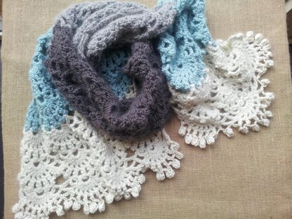 A simple lacy pattern that makes up quickly. The scarf is made in 2 halves, with the second half being crochet on the base chain of the first half. This is made with 4 different colours but this would also look lovely in one colour with maybe a contrast trim in Blue Sky`s Alpacas Silk.
