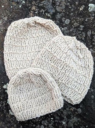 This hat is knit in the round. The body is worked in broken rib pattern. The pattern for the hat is reversible. Finished unstretched measurement at brim: approximately 17.25” (43.5 cm) small, 18.75” (48 cm) medium, and 20” (51cm) large in circumference. Length approximately 6” (15.5 cm), 7” (18 cm), 8.25” (21 cm)