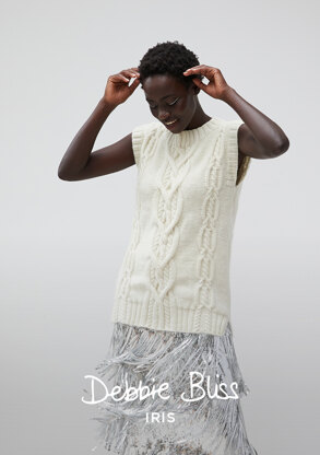 Deliciously plump Debbie Bliss Iris is the perfect yarn for Neve, a longline, sleeveless tunic with a gorgeous central cable that shows off the luxurious softness of this gorgeous yarn. The merino and cashmere content has a slight halo, that makes the fabric shimmer with softness - we are just dreaming of wearing this blissful jumper over long sleeves (or not!) and wow, knitted here in Swan 1, it feels like freshly fallen snow!