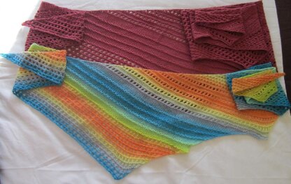The Shawl comes in two sizes - the larger using the yardage of a generous single skein or 3 x 50g balls of fingering yarn and has a length of 87". The smaller one is ideal for handspun as it needs only 270-300 yards of fingering but delivers a shawl length of 72"! The stitch patterns are simple yet engaging and the design will work well in solids, semi solids and long colour repeat yarns.